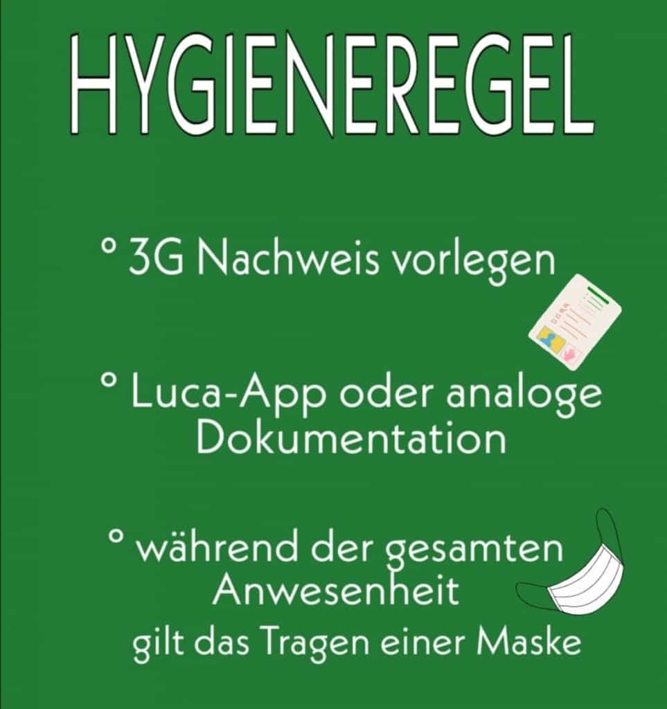 - diese (ab 14 Jahren) beim Betreten der Halle eine 3G-Nachweis vorlegen können, d.h. die Personen müssen „Geimpft“, „Genesen“ oder mindesten 24h zuvor negativ getestet (an einer Teststation) worden sein; Selbsttests vor Ort werden nicht bereitgehalten und auch nicht akzeptiert.